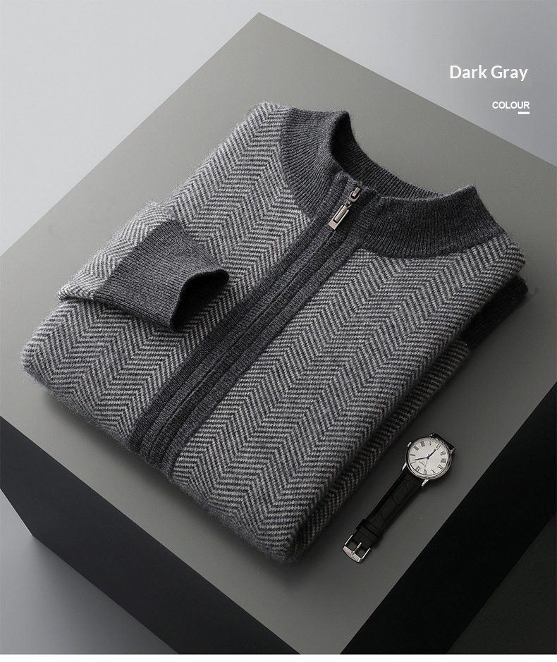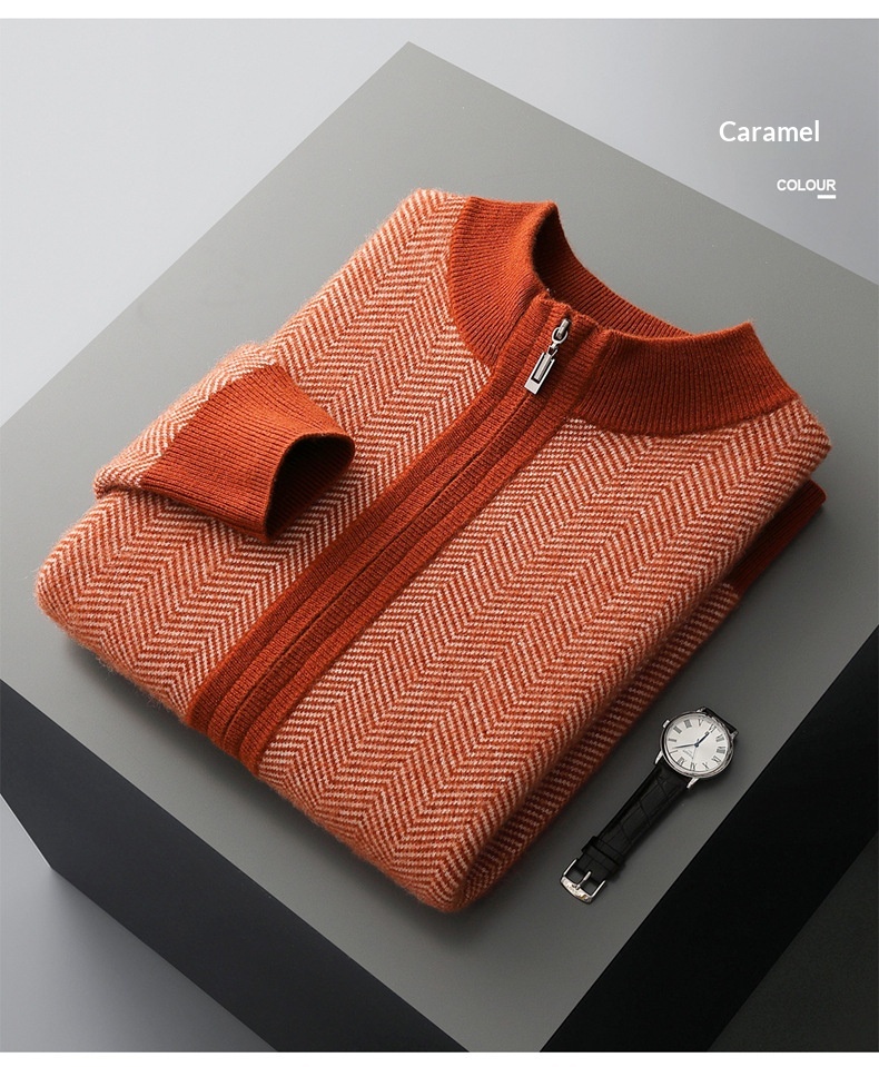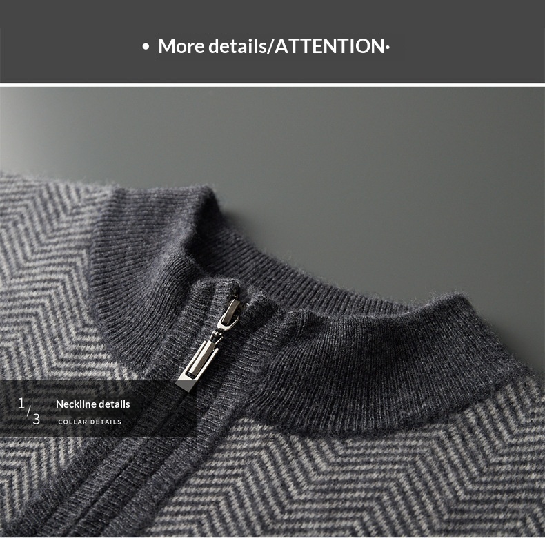 Mens Winter Pure Wool Sweater Half-Neck Zip-Up Cardigan With Thicker Outer Layer